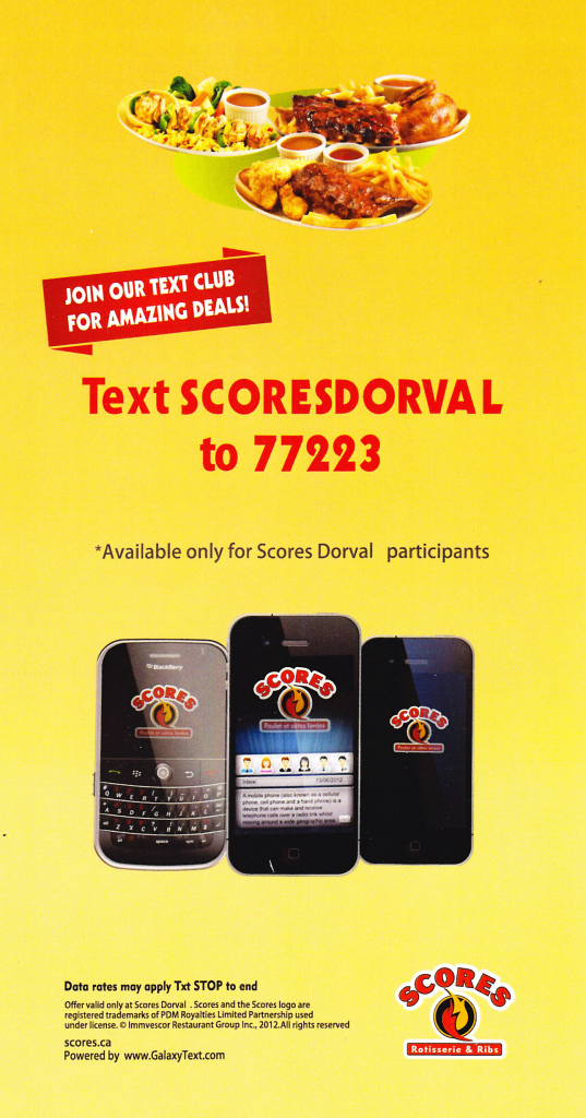 How do you become a VIP member? If you live near Scores Dorval, or swing by every so often in the restaurant all you need to do is text SCORESDORVAL to the short code 77223. That’s it!