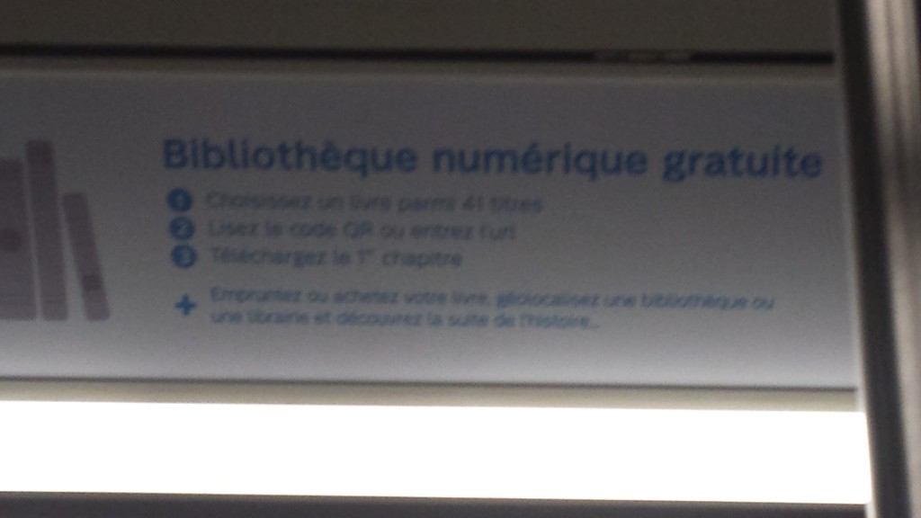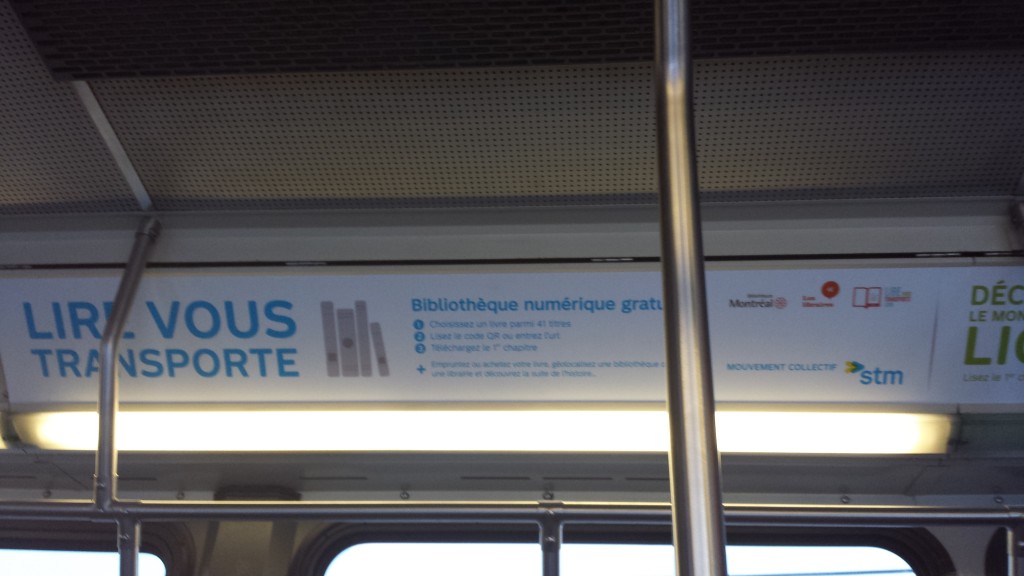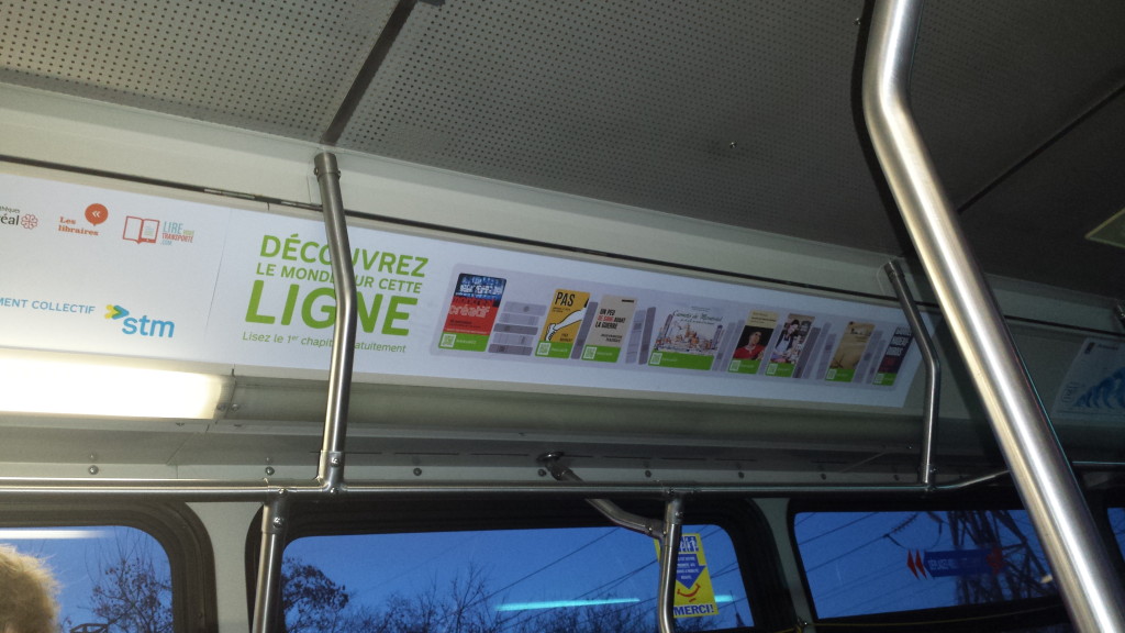 At the top of the advertising space on your STM bus, look for the “LIRE VOUS TRANSPOTRE” billboard. There will be a number of QR Codes on the billboard each representing a particular book. By scanning the QR code with your mobile phone you will be asked to be directed to the book/livre mobile site where you can download the digital copy (of course at a cost).