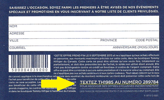 Having visited one Tommy Hilfiger store recently, I was given a rebate card in which I had a certain time to redeem my 10%-%25% off. Everything seemed interesting enough until the last folded card popped up. The very bottom of the card reads “TEXTEZ TH1985 AU 289784”. It is great that Tommy Hilfiger is reaching out to their audience by going mobile, however, placing the call-to-action message on the last card at the very bottom doesn’t help out the text campaign: